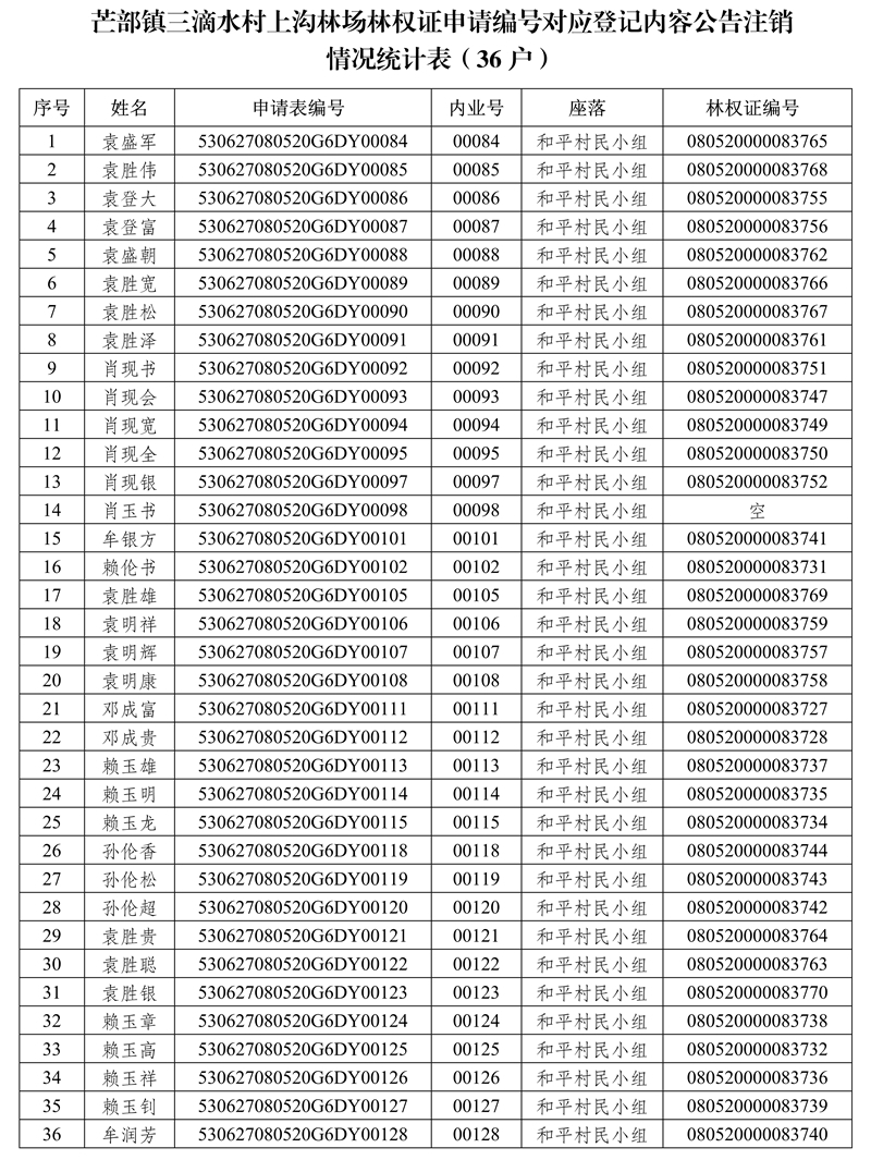 2、芒部鎮(zhèn)三滴水村上溝林場(chǎng)林權(quán)證申請(qǐng)編號(hào)對(duì)應(yīng)登記內(nèi)容公告注銷情況統(tǒng)計(jì)表(36戶)。