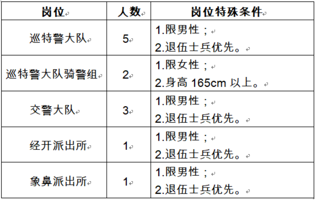 本次招聘崗位為祥云縣公安局巡特警大隊、交警大隊、經(jīng)開派出所、象鼻派出所警務(wù)輔助人員,用工形式為勞務(wù)派遣,主要工作職責(zé)為協(xié)助民警完成各項工作;本次招聘的警務(wù)輔助人員不納入編制管理,不具有人民警察和國家公務(wù)員身份,不行使人民警察職權(quán)。本次共計招聘警務(wù)輔助人員12名。其中巡特警大隊7名(男性5名,女騎警2名)、交警大隊3名、經(jīng)開派出所1名、象鼻派出所1名。具體招聘崗位、人數(shù)如下: