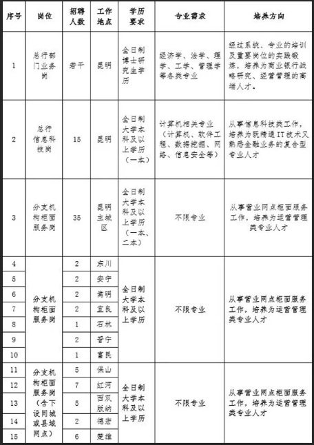 富滇銀行倡導(dǎo)和堅持“以人為本”的人才理念,積極為應(yīng)屆畢業(yè)生提供有競爭力的薪酬、完善的福利、專業(yè)的培訓(xùn)體系、廣闊職業(yè)晉升通道和發(fā)展平臺。根據(jù)業(yè)務(wù)發(fā)展需要,富滇銀行啟動2019年校園招聘,現(xiàn)將有關(guān)事項公告如下: