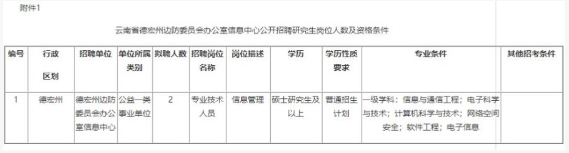 本次面向社會(huì)公開招聘碩士及以上研究生學(xué)歷人員2名(德宏州邊防委員會(huì)辦公室信息中心事業(yè)專技人員2名),具體崗位、條件、要求等詳見(附表1)。